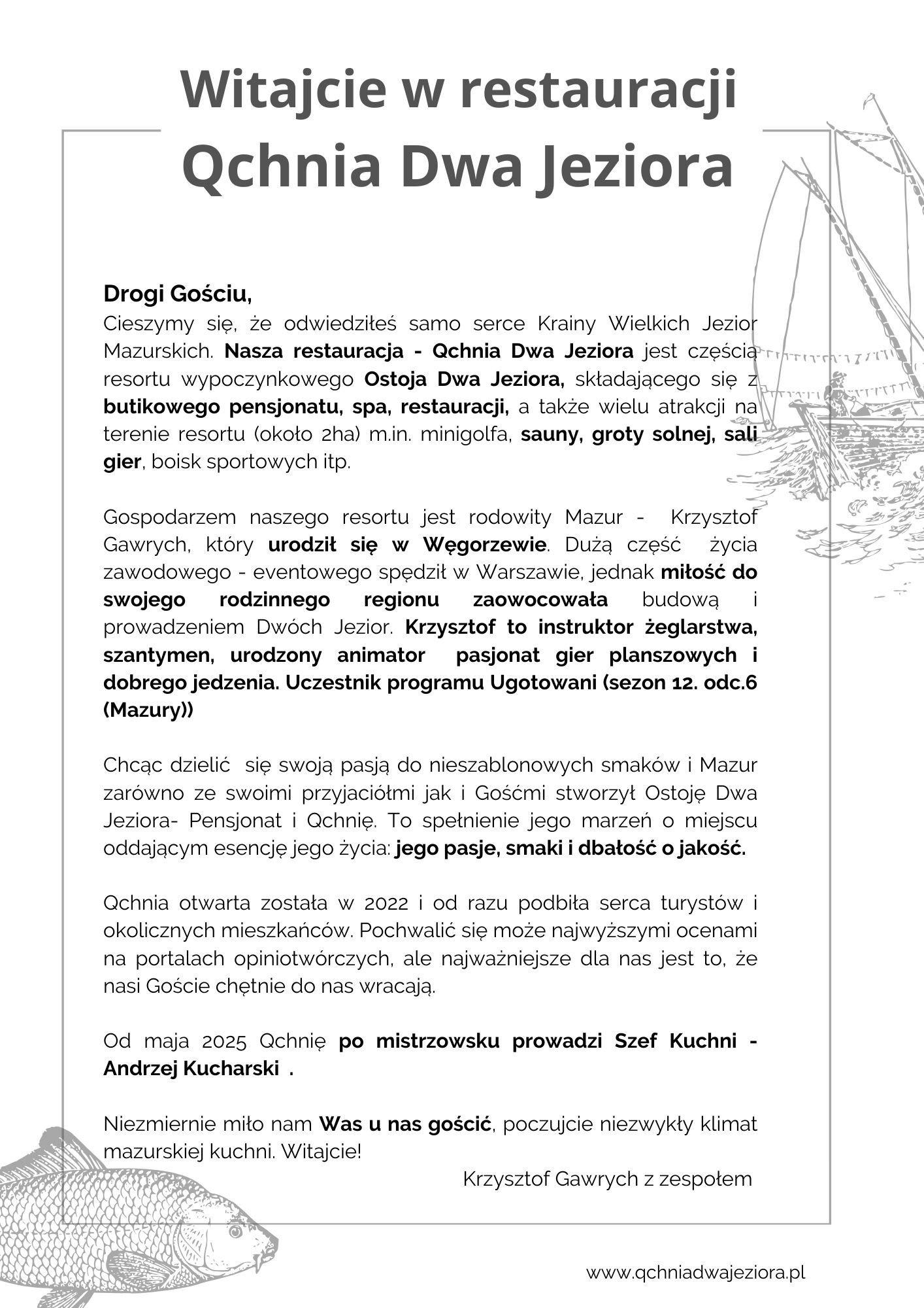 Gospodarzem naszego resortu jest Mazur z Mazur – Krzysztof, Gawrych, który urodził się w Węgorzewie. Dużą część życia zawodowego spędził w Warszawie, jednak miłość do swojego rodzinnego regionu zaowocowała budową i prowadzeniem Willi Dwa Jeziora. Krzysztof to instruktor żeglarstwa, urodzony animator i pasjonat gier planszowych. Chcąc dzielić się swoja pasja do nieszablonowych smaków i Mazur zarówno ze swoimi przyjaciółmi jak i Gośćmi stworzył Qchnie Dwa Jeziora. To spełnienie jego marzeń o miejscu oddającym esencję jego życia: jego pasje, smaki i dbałość o jakość.
